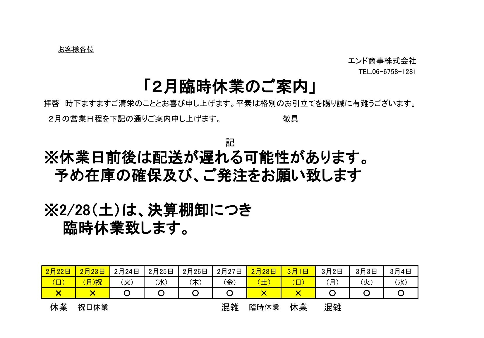 2026年2月28日(土)は、当社棚卸業務の為 外商部配送業務は休業とさせていただきます。 なお、C&Cエンド本店は16:00閉店 その他の店及び業務用食品館中崎町店・城東中央店は 17:00閉店とさせていただきます。 宜しくお願い致します。 2026年2月10日