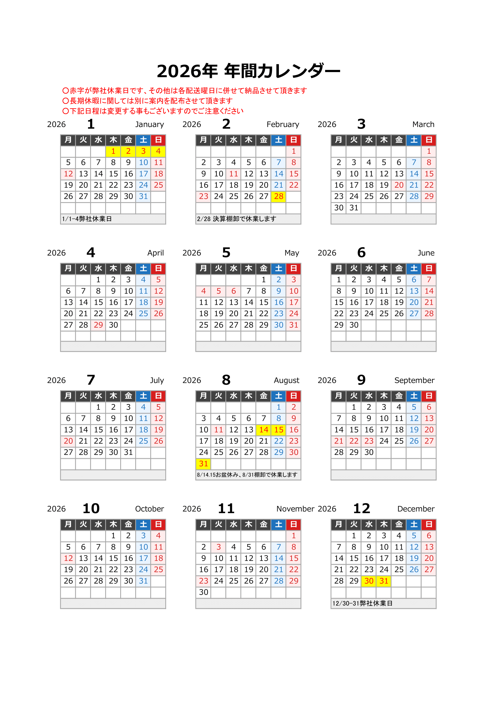 年間配送カレンダー